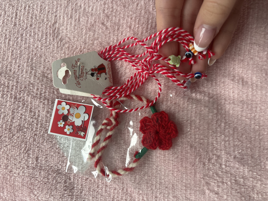 - "The scene displays several Martenitsa-style charms and bracelets, laid out on a light pink, plush textile surface in Getafe, Spain" by FM-MaXlU2, licensed under CC BY 4.0