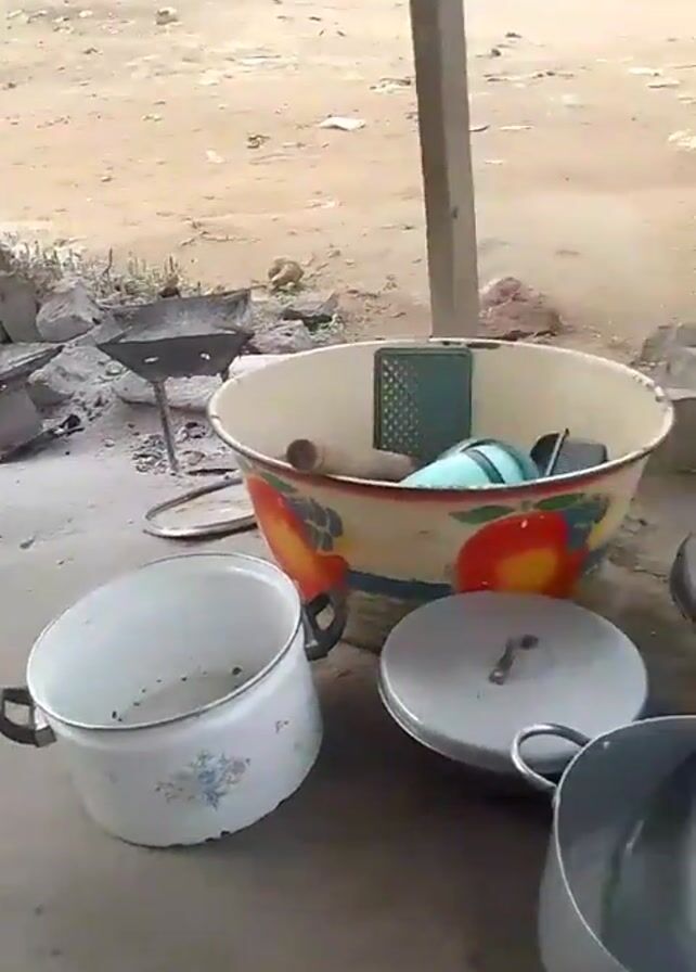 n outdoor area with various cooking and washing implements. There are several pots, pans, and basins of different sizes scattered on the ground. Some contain water or oily residue. There are also several empty buckets. In the background, there are charcoal stoves and a sandy open space with a person walking in the distance. The overall scene appears to be a makeshift outdoor kitchen or cleaning area.