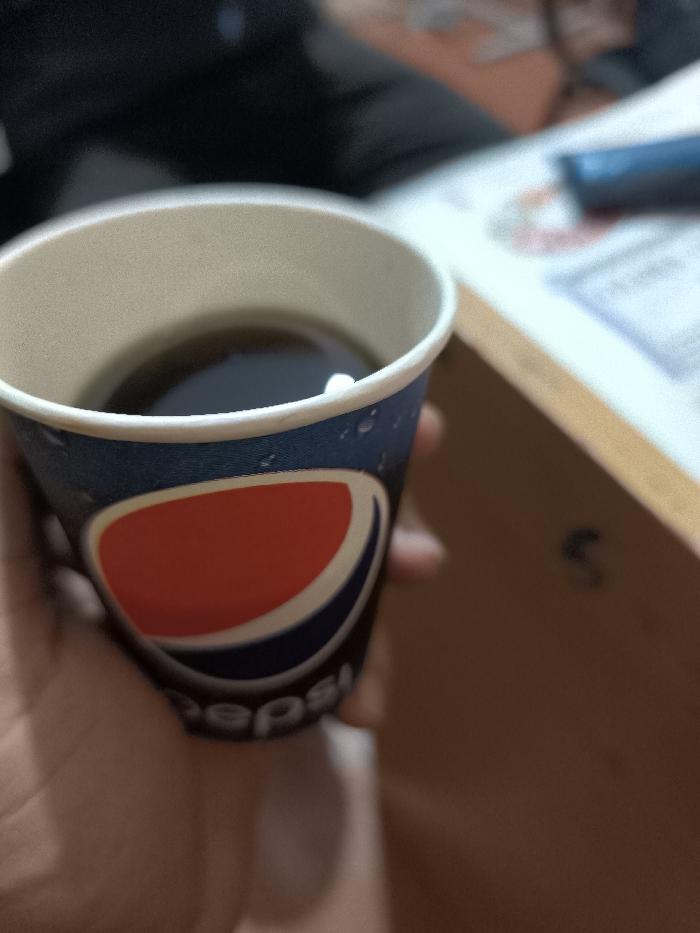 - "The scene depicts a close-up, eye-level view of a disposable paper cup containing a dark beverage, likely soda, held by a human hand in an indoor setting within Pakhtakor, Uzbekistan" by FM-icMD83, licensed under CC BY 4.0