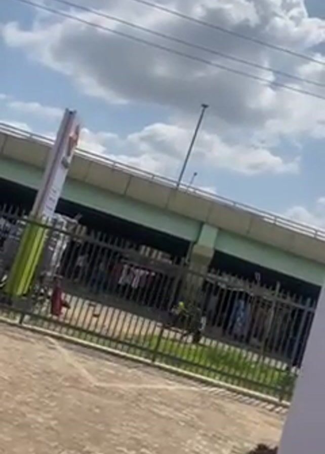 n outdoor scene with a cloudy sky. In the foreground, there's a black metal fence running parallel to the bottom of the frame. Behind the fence is a paved area with grass and some visible vegetation. In the middle ground, there's a tall, thin sign with red and white coloring, possibly a brand marker. Behind the sign is a light green overpass structure. Below the overpass, there's an area that appears to have several people present and some clothes hanging. There are some poles in the distance as well.