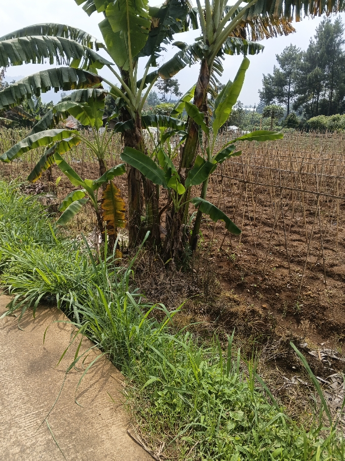 A scene depicting banana trees prominently in the foreground, with a field of small wooden stakes stretching into the distance. The ground is predominantly brown. Lush green grass grows along the edge of a concrete path in the lower left corner. The background features trees. The sky is bright and appears to be daytime.