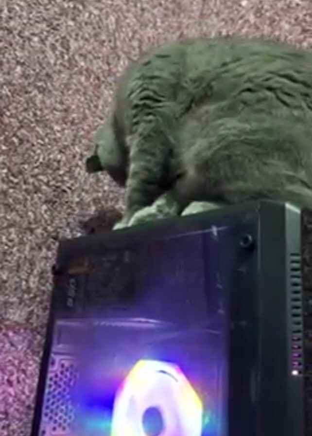 - "A medium shot shows a gray cat sitting on top of a black computer case" by FM-uAaZs1, licensed under CC BY 4.0