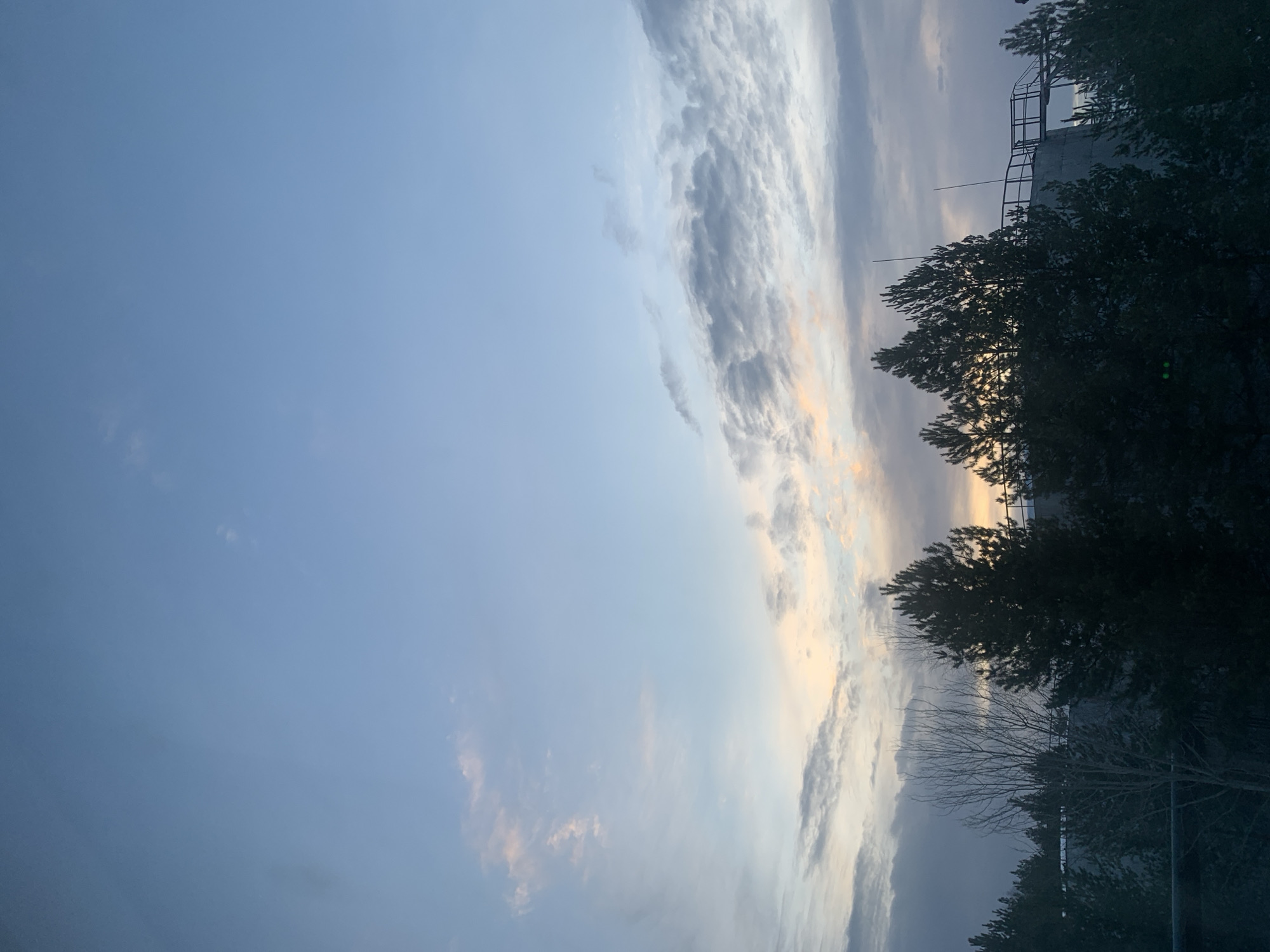 The image depicts an outdoor scene in Chaikovsky, Russia, at dawn or dusk. The upper two-thirds of the frame display a sky transitioning from a light blue zenith to a lower horizon line exhibiting scattered grey, white, and pale orange/pink clouds. The lower third of the frame is dominated by a dense line of trees, primarily dark green evergreens, with one prominent bare deciduous tree positioned slightly left of center. Behind the trees, a large, curved, grey industrial structure, possibly a tank or building, is partially visible and silhouetted. This structure is topped by a metal railing or walkway and two slender, vertical antenna-like poles. No individuals or specific actions are discernible within the frame.
