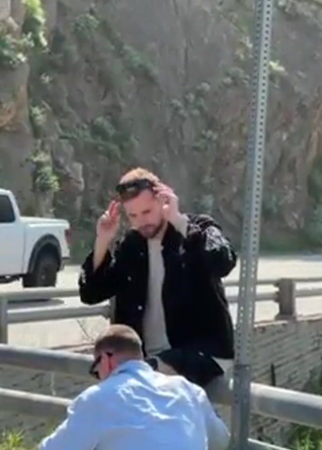 Two men are at the side of a road by a railing. One man sits on the railing while the other kneels and takes pictures of him. The seated man wears a black jacket over a white shirt and dark shorts. He puts on a pair of sunglasses. The photographer wears a light blue shirt and dark shorts. Cars pass on the road behind them. There is a large, mountainous hill in the background, along with utility poles and wires. The sun is shining.