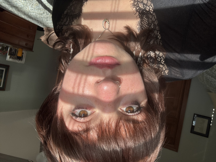 A woman with brown hair and eyes looks directly at the camera from a close-up, slightly tilted perspective. Sunlight streams across her face, creating shadows. She has a nose ring and is wearing a dark top with lace detailing around the neckline. A necklace is visible. The background includes parts of a room with furniture, like a dresser, and framed pictures on the wall.