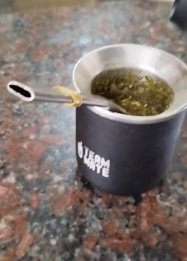 A close-up shot shows a black TEAM MATE brand cup on a brown and grey granite countertop. The cup contains yerba mate and a silver bombilla (drinking straw) with a gold accent at the top. Water is poured from a black thermos into the cup, saturating the yerba mate. The background includes a glimpse of light-colored cabinets and walls, suggesting an indoor kitchen or dining area.