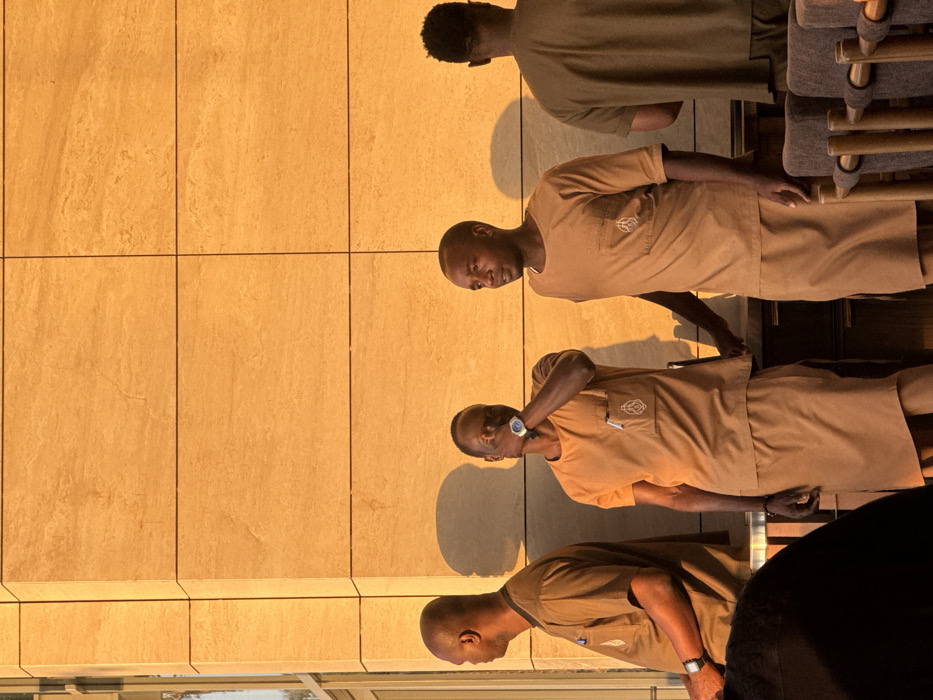 Four men in tan uniforms stand near a light brown tiled wall. They appear to be in a row, with the top man facing away from the camera and the bottom man partially obscured. The middle two men are looking down, with one glancing at his watch. Each uniform has a logo on the breast pocket. The lighting is bright, with strong shadows cast on the wall.