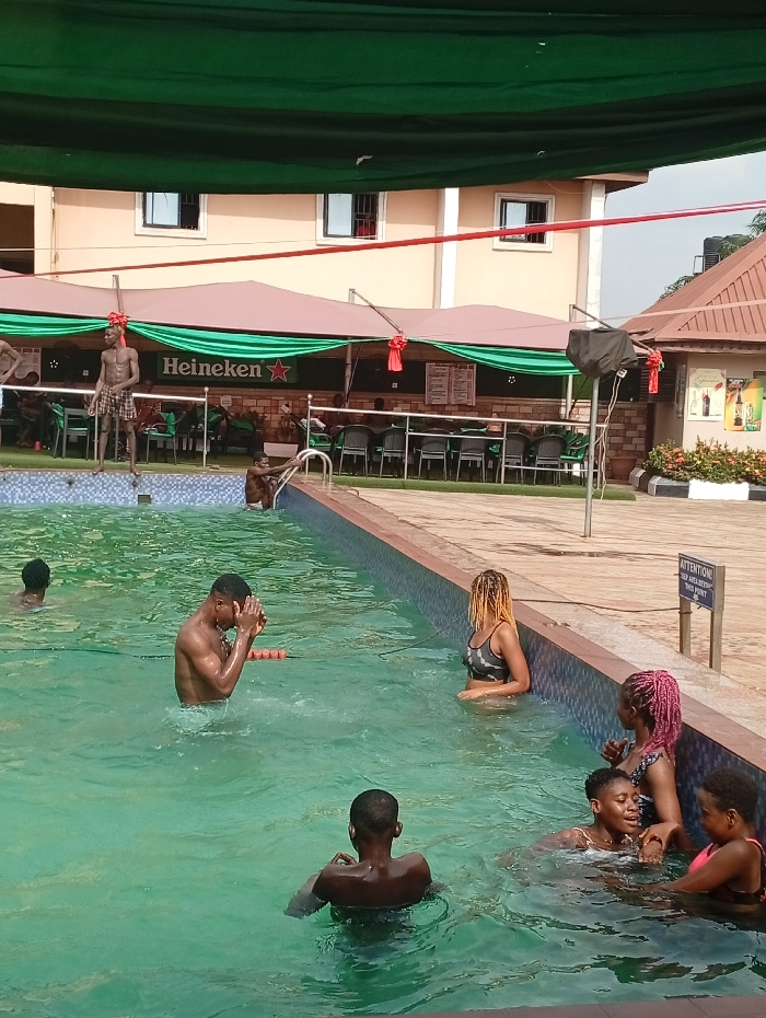 The image depicts an outdoor swimming pool facility located in Onitsha, Nigeria