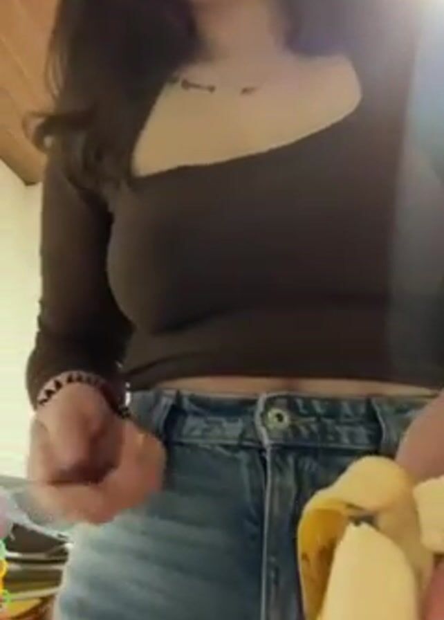 A young woman with long dark hair is standing indoors wearing a brown long-sleeved shirt and blue jeans. She is peeling a banana with her hands and cutting it into pieces with a fork. A small tattoo is visible on her chest. The background includes a wooden ceiling, a light fixture, and other items that are out of focus.