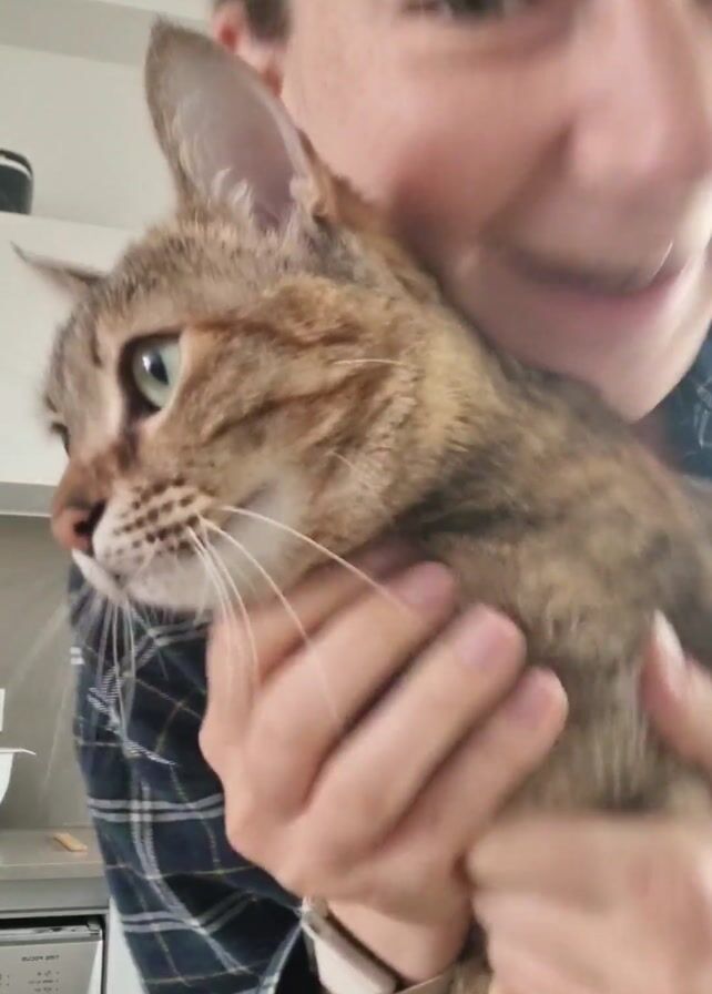 A woman in a blue and green plaid shirt is holding a brown tabby cat. She is kissing the cat on the head. The cat appears displeased and opens its mouth as if to hiss or meow loudly. The woman is smiling. In the background is a kitchen counter and a white appliance. The woman is wearing a watch. The scene appears to be filmed with a cell phone.