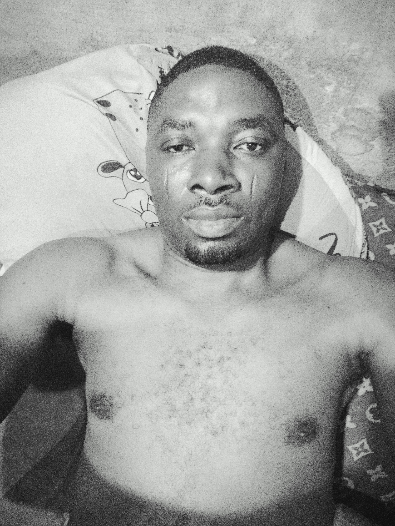 A black and white photograph captured indoors, likely within the city of Gawuna, Nigeria, shows an adult male from the chest up, lying on his back and looking directly at the camera. The male subject has dark skin, short dark hair, and a short beard or stubble. Notable features include distinct facial scarification marks: a prominent vertical scar below his right eye and a shorter scar below his left eye. He is bare-chested, displaying visible chest hair. His head rests on a light-colored pillow adorned with a cartoon animal pattern, specifically depicting a dog's head with a bow tie. To the right of the pillow, a piece of fabric with a geometric pattern, resembling the Louis Vuitton monogram, is partially visible. The background behind the subject and pillow appears to be a textured, light-colored wall or surface. The scene is static, with no active interactions or movements observed.