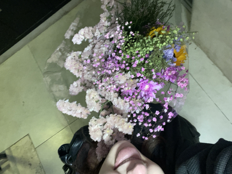 A person holds a large bouquet of flowers. The bouquet features various colors, including white, pink, purple, yellow, and green. The arrangement is full and appears to be wrapped in clear cellophane. Part of the person's face, including the nose and mouth, is visible in the lower portion of the image. The background is a neutral color, possibly a tile floor or wall.