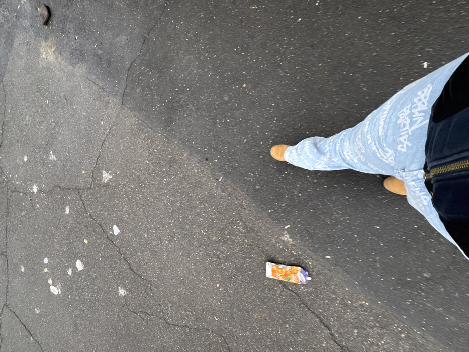 Asphalt surface with cracks and debris, including a small orange juice carton. The photo captures a portion of a person wearing light blue pants with white prints and tan shoes. A black garment is visible on the upper right of the frame. The angle is a top-down perspective, focusing on the ground and the subject's legs and feet.