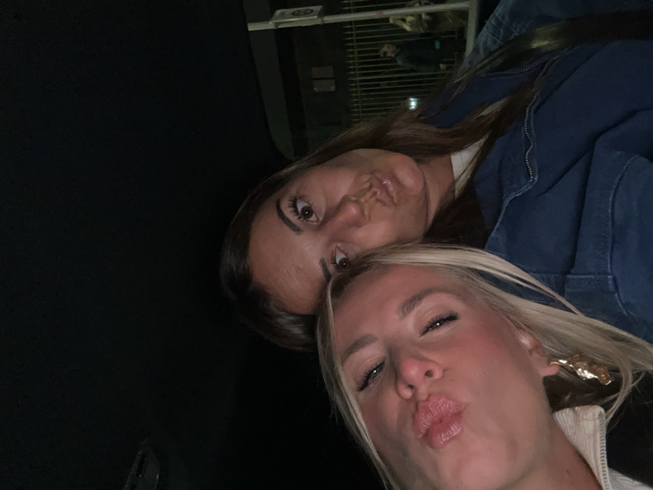 Two women pose for a selfie, making kissing faces. One woman has long, dark brown hair and is wearing a blue denim jacket. The other woman has blonde hair and a white jacket. A black background fills the left side of the frame. Behind the brunette is a structure with vertical lines.