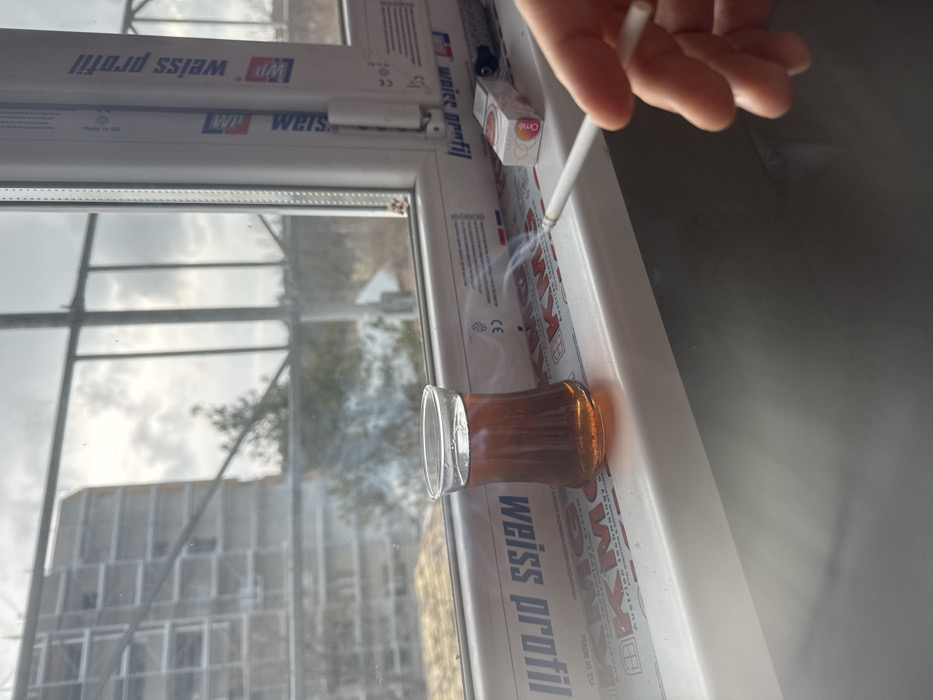 The image presents a forensic, close-up view from an interior space looking out through a window in Novi Pazar, Bulgaria. A light-skinned human hand is positioned on the right, holding a lit white cigarette from which a plume of smoke actively rises. The cigarette's burning tip is visible. On the white PVC windowsill, to the immediate right of the cigarette, rests a white and red cigarette pack identified as "Omni" and a black cylindrical object, likely a lighter. To the left of the cigarette, a clear, tulip-shaped glass, filled with a dark amber liquid presumed to be tea, sits on the windowsill. The white PVC surface of the windowsill displays inverted red branding text including "WEISS PROFIL," "KMG," and "AUSTRIAN technology," suggesting protective labeling on new window frames. Through the window, an overcast sky is visible. In the mid-ground, a multi-story building under construction, enveloped in scaffolding, stands prominently. Evergreen trees and other distant, smaller buildings with roofs are also visible beneath the cloudy conditions.