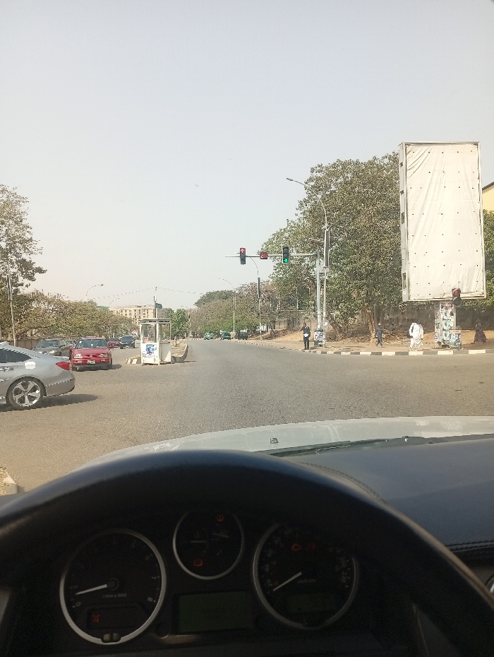 The image depicts an urban road intersection in Abuja, Nigeria, viewed from inside a vehicle, indicated by a dark steering wheel and instrument cluster in the foreground