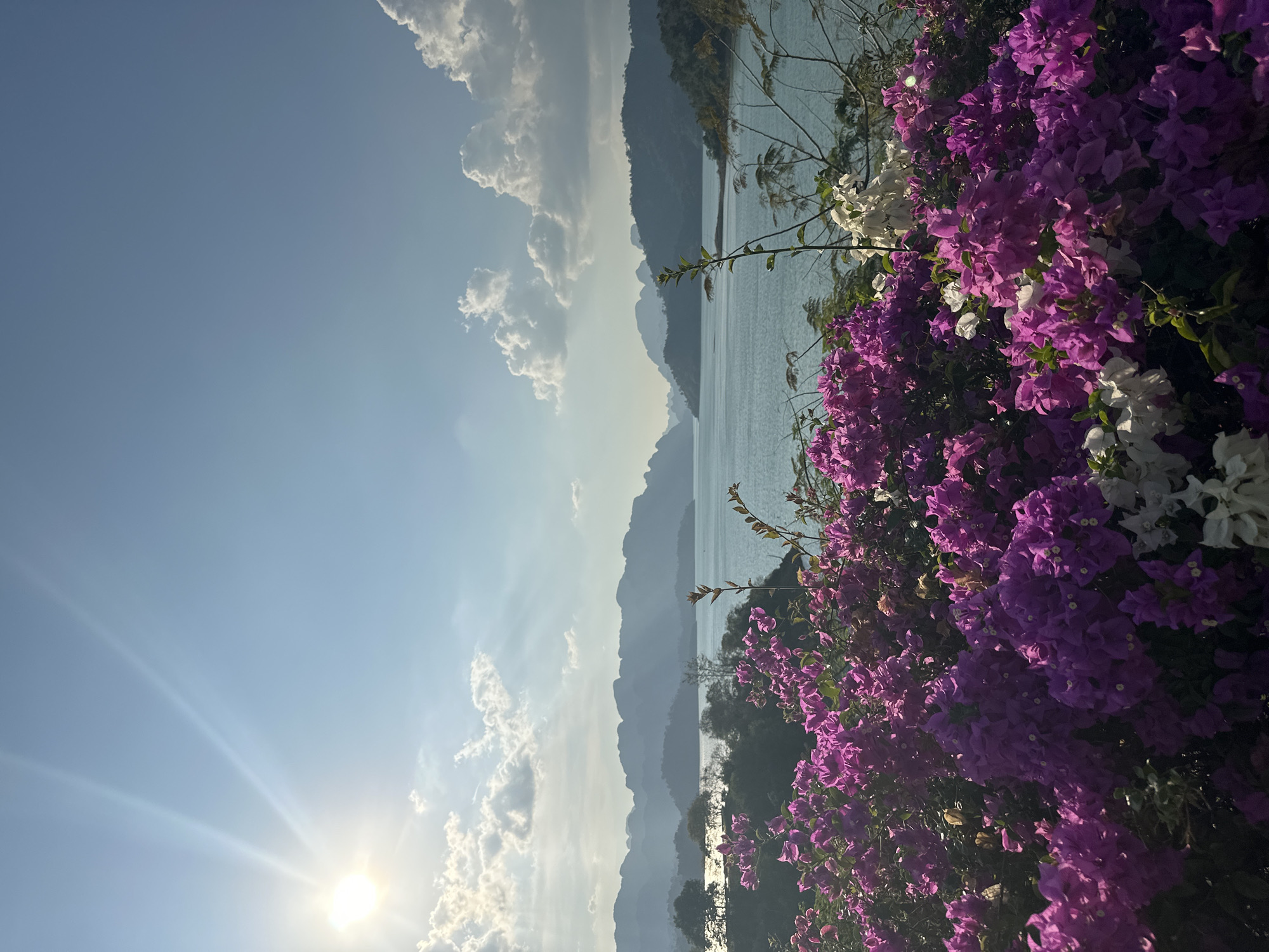 scenic view of Cheow Lan Lake in Ban Chiao Lan, Thailand. Lush purple and white bougainvillea flowers fill the right side of the frame, contrasting with the lake and mountain range in the background. The water is a light blue-gray, reflecting the sky. The mountains are layered, fading into a hazy distance. The sky transitions from a bright, sunlit lower left to a paler blue with scattered white clouds on the left. The sun's glare is visible at the bottom left.
