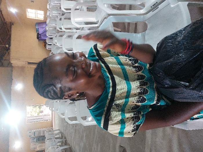 An indoor scene in Akwanga, Nigeria, depicts a single female individual seated on a white plastic chair. The female has dark skin, black braided hair styled in cornrows with geometric patterns on the sides of her head, and is wearing a short-sleeved top featuring horizontal stripes of cream/pale yellow and teal/turquoise with black patterns. She is smiling broadly, with her eyes partially closed, and her head is tilted slightly. Her right hand is raised, appearing somewhat blurred, and multiple red and blue bangles are visible on her wrist. A black plastic bag rests on her lap. The background shows a large room with light brown/beige walls and a grey concrete floor. Numerous identical white plastic chairs are arranged in rows, with some stacked in the far left background. An open doorway on the left provides natural light and a view of outdoor foliage. A window is visible on the far right. Two bright light sources, likely bare bulbs, are active overhead, casting a strong glare. A table draped with a purple cloth is located in the far right background, behind additional white chairs. A partial view of a metal roof structure or ceiling support is visible at the top, along with a ceiling fan.