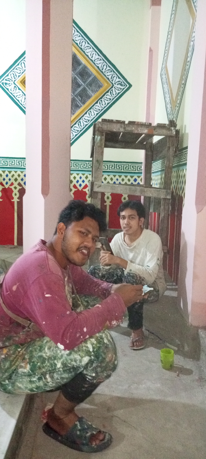 Two painters are taking a break in a hallway. The man on the left is squatting, wearing paint-splattered clothing and slides. The man on the right is seated, holding a phone. Behind them, scaffolding stands against a wall with decorative designs and a window. Pillars painted in light pink frame the scene. A green cup sits on the floor.