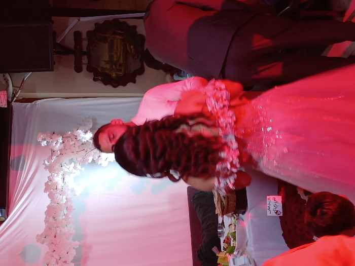 A wedding scene unfolds with a bride in a sparkling gown and a groom in a white shirt embracing. White flower decorations adorn a backdrop, with a black speaker and a gold balloon visible. Red lighting bathes the room. Other individuals are nearby, including a man in an orange shirt. A decorative sign can be seen, along with a table featuring floral arrangements.