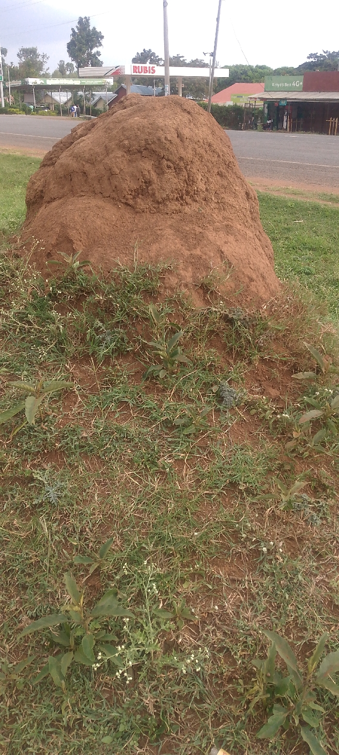 A large, brown termite mound dominates the foreground, surrounded by sparse grass and small plants. In the background, across a road, a "RUBIS" gas station is visible, along with a building displaying "Kenya's Best 4G+." The sky is overcast, suggesting cloudy weather. The foreground is in focus, making the termite mound the primary subject.