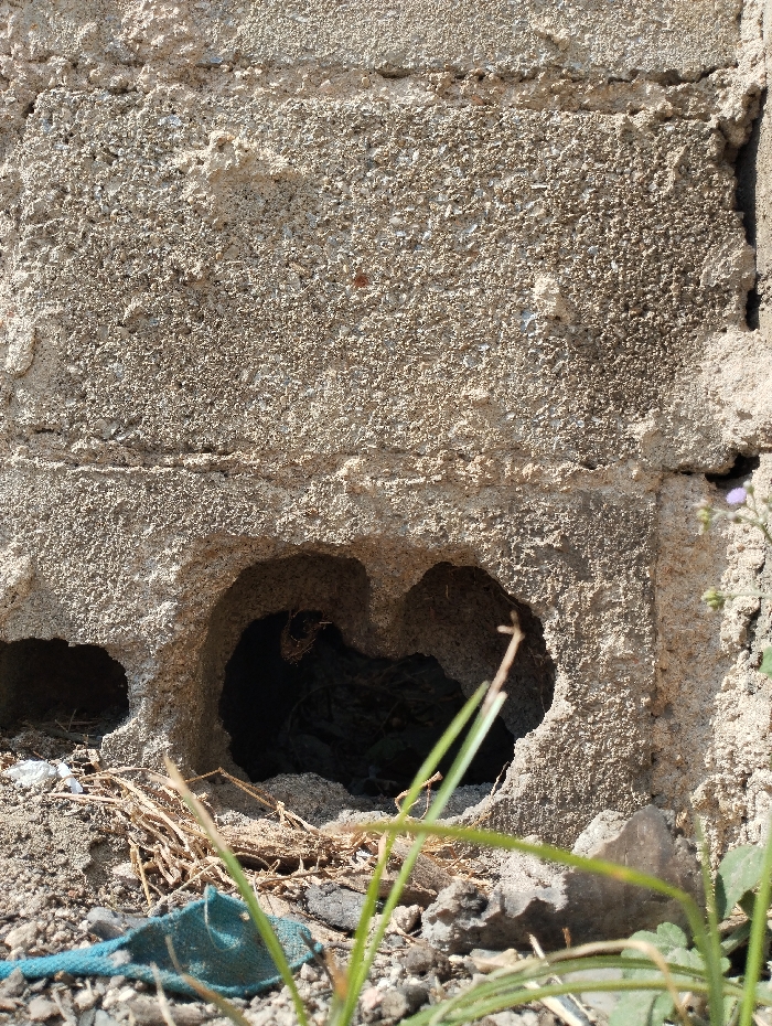 A close-up, low-angle photograph depicts a damaged section of a concrete block wall in an outdoor, brightly lit environment located in Guacara, Venezuela. The wall is constructed from light gray, rough-textured concrete blocks. The upper block appears intact but weathered. The lower block exhibits a large, irregular central void, roughly kidney-shaped, and a smaller, rounder hole to its left. Within the largest void, a dark, tangled mass, consistent with black fabric or plastic material, is visible. The ground directly beneath the damaged section of the wall consists of loose soil, gravel, and scattered debris. An accumulation of dry, light brown fibrous material, resembling dead grass or twigs, is present immediately in front of the large void. A crumpled piece of teal-colored fabric or plastic is partially visible on the ground to the left. Several blades of green grass grow in the extreme foreground. No human individuals, active events, or specific interactions are observed.