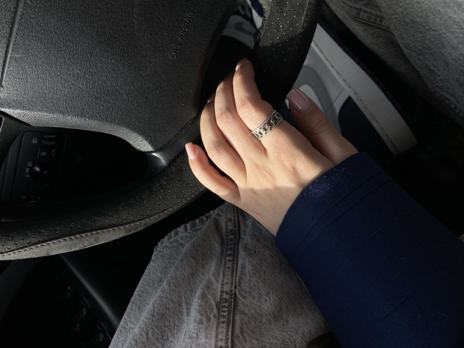 The scene depicts the interior of a vehicle, located in Björklinge, Sweden. A person's left hand, with light-toned skin and nails with a pale pink polish, rests upon the black, textured steering wheel, which features red stitching and an 'SRS AIRBAG' label on its center hub. A silver-colored ring with a chain-link pattern is worn on the ring finger. The individual's left arm is covered by a dark blue long-sleeved garment, and gray denim pants are visible on the left leg. A portion of a sneaker, showing white and dark blue sections, is visible under the steering wheel and beside the pant leg. In the upper left background, dark interior paneling with vehicle controls, including window switches, is visible. The scene is brightly illuminated by natural light, casting distinct shadows.