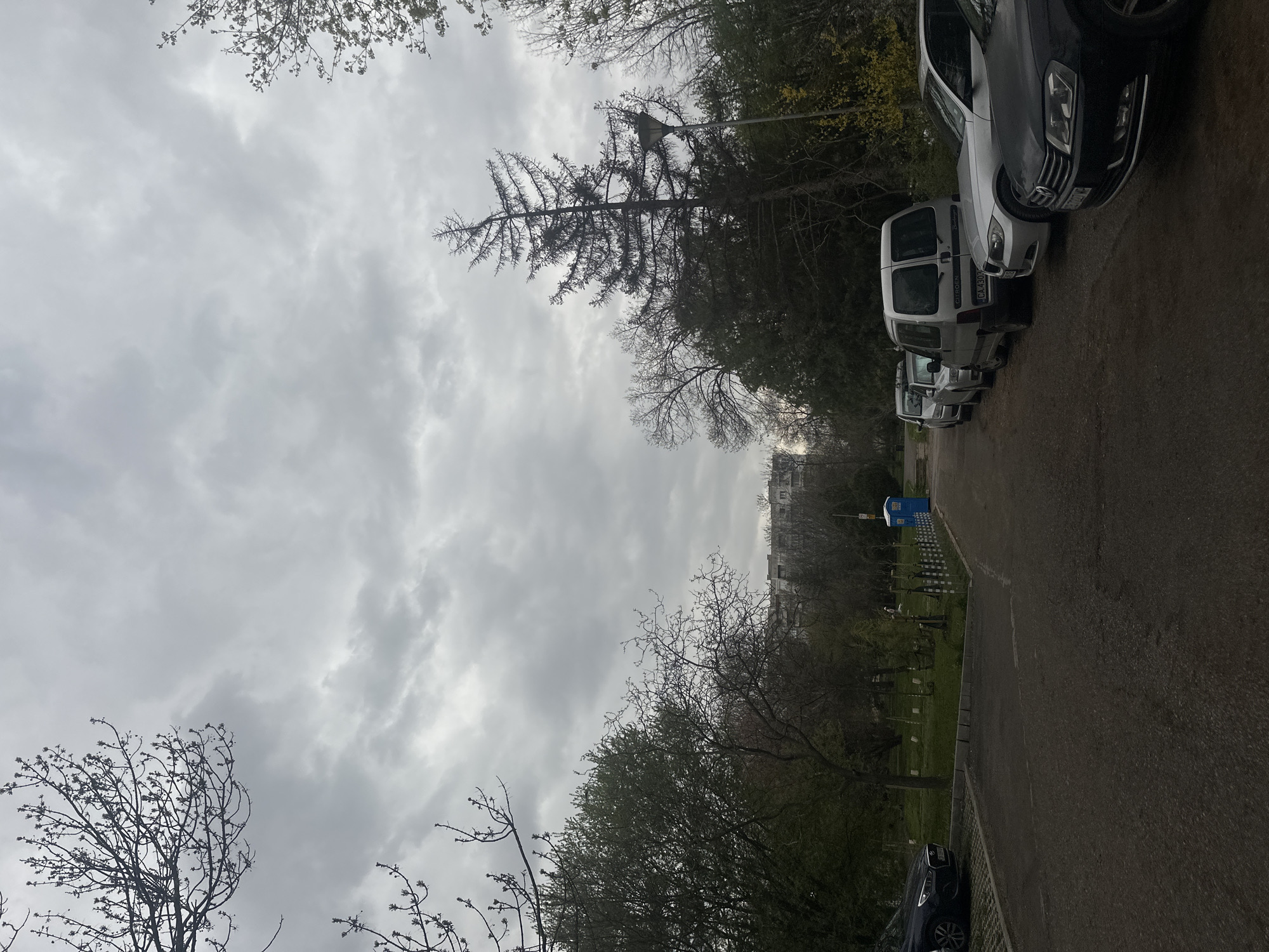 The image captures a street scene, likely in Sofia, Bulgaria. The sky is overcast. Parked cars line the right side of the street, including a white Citroen van with license plate "CA 4307 CM" and a black sedan. Across the street is a green area, possibly a park or cemetery, marked by white fences and a blue portable toilet. Bare trees are prominent, and in the distance, a building is visible.