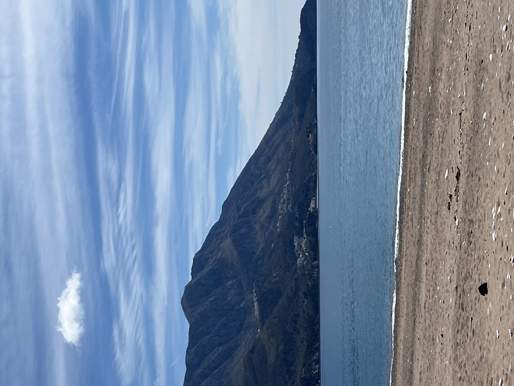 The image depicts a coastal scene in Boreti, Montenegro. A large mountain dominates the left side of the frame, rising steeply from the shoreline. The mountain is covered in vegetation and appears to have some small buildings or structures along its lower slopes. The sky above the mountain is blue with wispy, streaky clouds. To the right of the mountain is a body of water, likely the Adriatic Sea, which is a calm blue color. A narrow strip of beach runs along the right edge of the frame. The sand is a mix of brown and grey, with some visible pebbles and small debris.