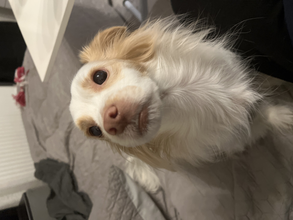 - "A small, long-haired dog, predominantly white with tan markings on its ears and around its eyes, is depicted looking directly into the camera" by FM-WeJth2, licensed under CC BY 4.0