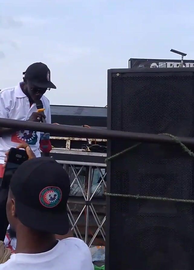 man speaking into a microphone while standing on a raised platform, possibly a vehicle. The man is wearing a white shirt with a design and a black cap. He is gesturing with his hands as he speaks. A crowd of people, most of whom have their backs to the camera, surrounds the platform, some recording him with their phones. The environment appears to be an outdoor urban setting with buildings and billboards visible in the background. The overall tone is celebratory, as the man on the platform seems to be addressing a crowd.