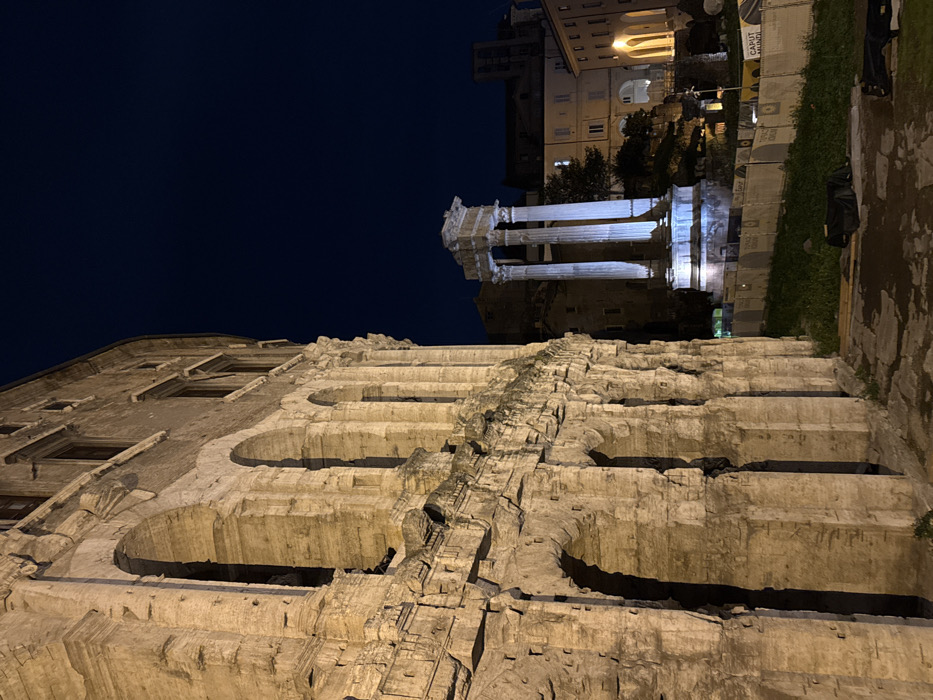 A nighttime scene reveals ancient Roman ruins