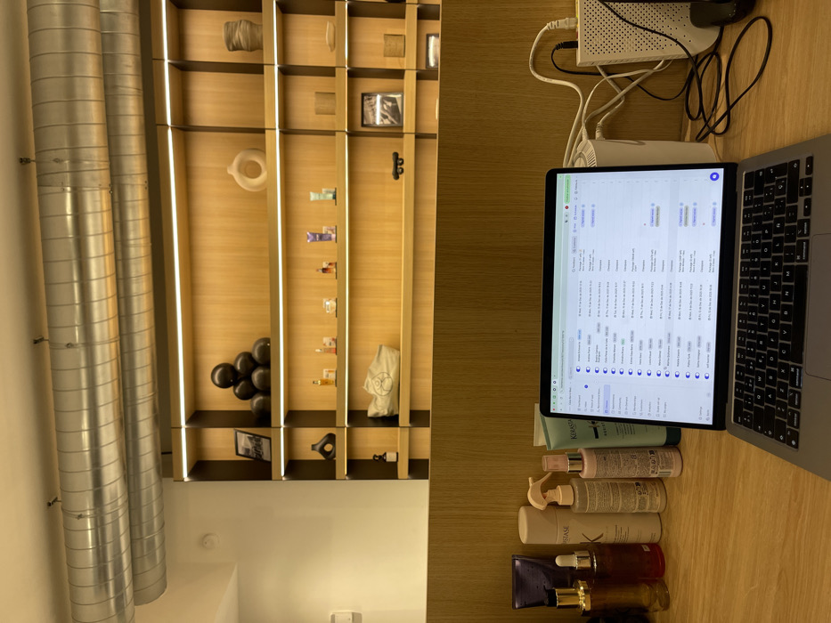 The image displays an indoor environment, likely a commercial establishment or office in Madrid, Spain, indicated by Spanish language text visible on a laptop screen. The precise address within Madrid cannot be visually determined. In the foreground, a light-colored wooden desk surface is visible. On the left, a collection of cosmetic and hair care products, including various bottles, pumps, and spray containers, some labeled "KÉRASTASE," are arranged. To the right, an open silver MacBook laptop occupies the central space, displaying a web browser interface with a list of contacts or appointments, showing names and dates predominantly from December 2023. Further to the right of the laptop, a white cylindrical Wi-Fi router and another white rectangular network device are connected by multiple white cables, with black power cords visible, indicating an active workstation. A black computer mouse is partially visible beside the network devices. The midground features a continuation of the light wooden paneling, forming a partition or counter. In the background, a wall-mounted shelving unit is present, constructed of light wood with dark vertical dividers and integrated horizontal LED strip lighting illuminating each shelf. - The top shelf displays a framed picture on the left, a stack of black spherical decorative objects, a cream-colored abstract sculpture, and a woven cylindrical object on the right. - The middle shelf holds a row of small bottles and jars, indicative of beauty or cosmetic products. - The bottom shelf features a dark bottle on the left, a light-colored tote bag with a circular logo, a pair of black sunglasses, and a framed picture on the right. Above the shelving unit, exposed galvanized metal air ducts are suspended horizontally from a white ceiling. No individuals are visible in the scene. The overall environment suggests a clean, modern aesthetic, possibly a salon, spa, or a contemporary office space dealing with beauty-related services or products.