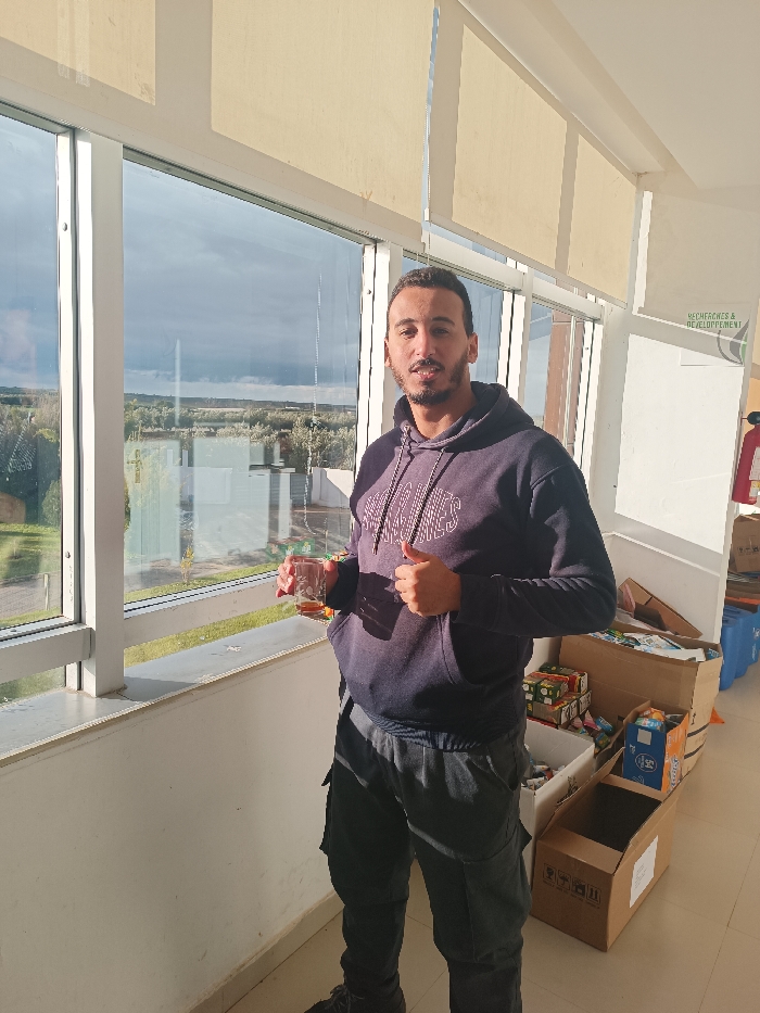 A man in a dark blue hoodie and dark pants stands in front of a large window, holding a glass in his left hand and gesturing with his right. The window reveals a green landscape under a cloudy sky. Next to him is a stack of cardboard boxes containing various items. The room appears to be well-lit with natural light, and a sign with text is visible on the wall behind the boxes.