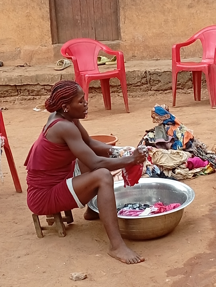 A woman with braided hair sits on a small wooden stool, washing clothes in a large silver basin. She wears a maroon dress with white trim. A pile of colorful laundry sits to her right. Behind her are two red plastic chairs on a stone surface, with slippers visible. The background shows a textured brown building and a dirt ground.