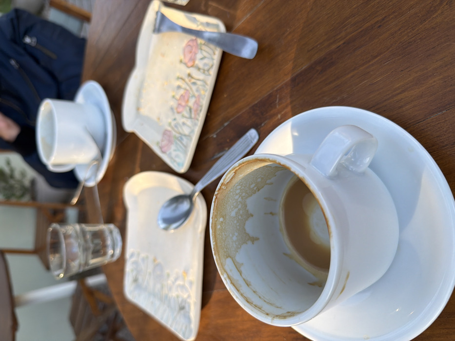 The scene captures a wooden table setting with remnants of a meal or refreshments. An empty, slightly stained white coffee cup rests on a saucer. Nearby, there are two ornate, bread-slice-shaped plates, each with a spoon or fork placed on top. One plate features a floral pattern. A small, mostly empty glass is also visible. In the background, a portion of a person's blue jacket is visible, along with an out-of-focus glimpse of outdoor furniture.