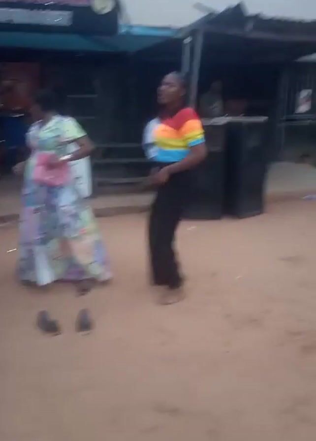 three women in a dirt parking lot area in front of a storefront labeled "CHUKWUEDEBUKA SUPERMARKET." One woman is wearing a long colorful dress with a pink purse and is standing near a pair of black heels. Another woman is wearing black pants and a colorful striped shirt, and is moving her arms slightly. A third woman in a red shirt and black pants is walking near the left edge of the frame. There is a black speaker to the right and a few people visible in the background, some sitting on steps. The setting appears to be a small town or village. The weather is overcast.