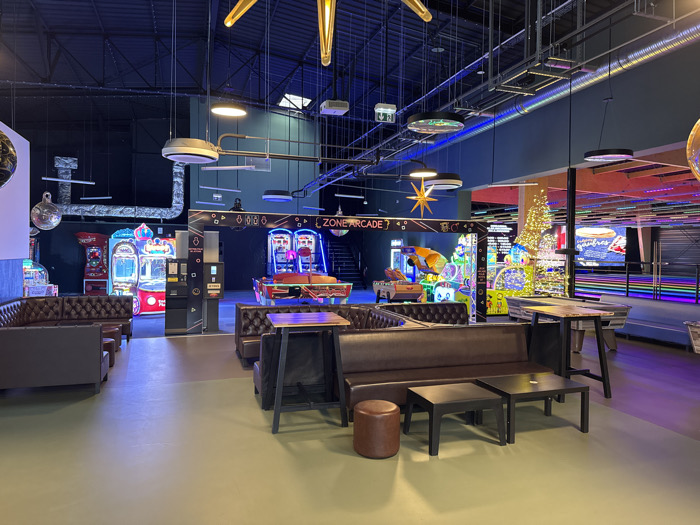 This image depicts the interior of a modern entertainment complex, identified as a "Zone Arcade" located within the Centre Commercial Saint-Sever in Rouen, France. The scene presents a spacious, high-ceilinged environment with an industrial aesthetic, featuring a dark, possibly black, ceiling from which exposed silver-colored ventilation ducts and various lighting fixtures are suspended. The floor is a uniform light olive-green. The primary lighting consists of ambient blue and purple hues, augmented by bright, multi-colored illumination emanating from numerous arcade machines and decorative elements. In the foreground, two distinct lounge seating areas are visible. To the left, a brown leatherette, button-tufted banquette sofa is arranged in an L-shape with a dark brown rectangular coffee table. To the right, another similar brown leatherette banquette sofa is accompanied by two square dark brown coffee tables and a round brown leatherette stool. A tall, dark metal table with a wooden top stands adjacent to this seating. The midground transitions into an active arcade zone. A prominent sign above a central dark kiosk station reads "{ZONE ARCADE}". To the left of this central point, a row of brightly lit arcade machines is visible, including claw machines and other electronic games, alongside a large spherical metallic decoration. To the right of the kiosk, additional arcade games featuring colorful graphics and animated displays are present. A prominent, tall festive decoration, resembling a golden-lit Christmas tree, stands near these games. Further right, a bowling lane with rainbow-colored stripes and a large screen displaying text is partially visible. No individuals are present within the frame, indicating the facility is vacant at the time of capture.