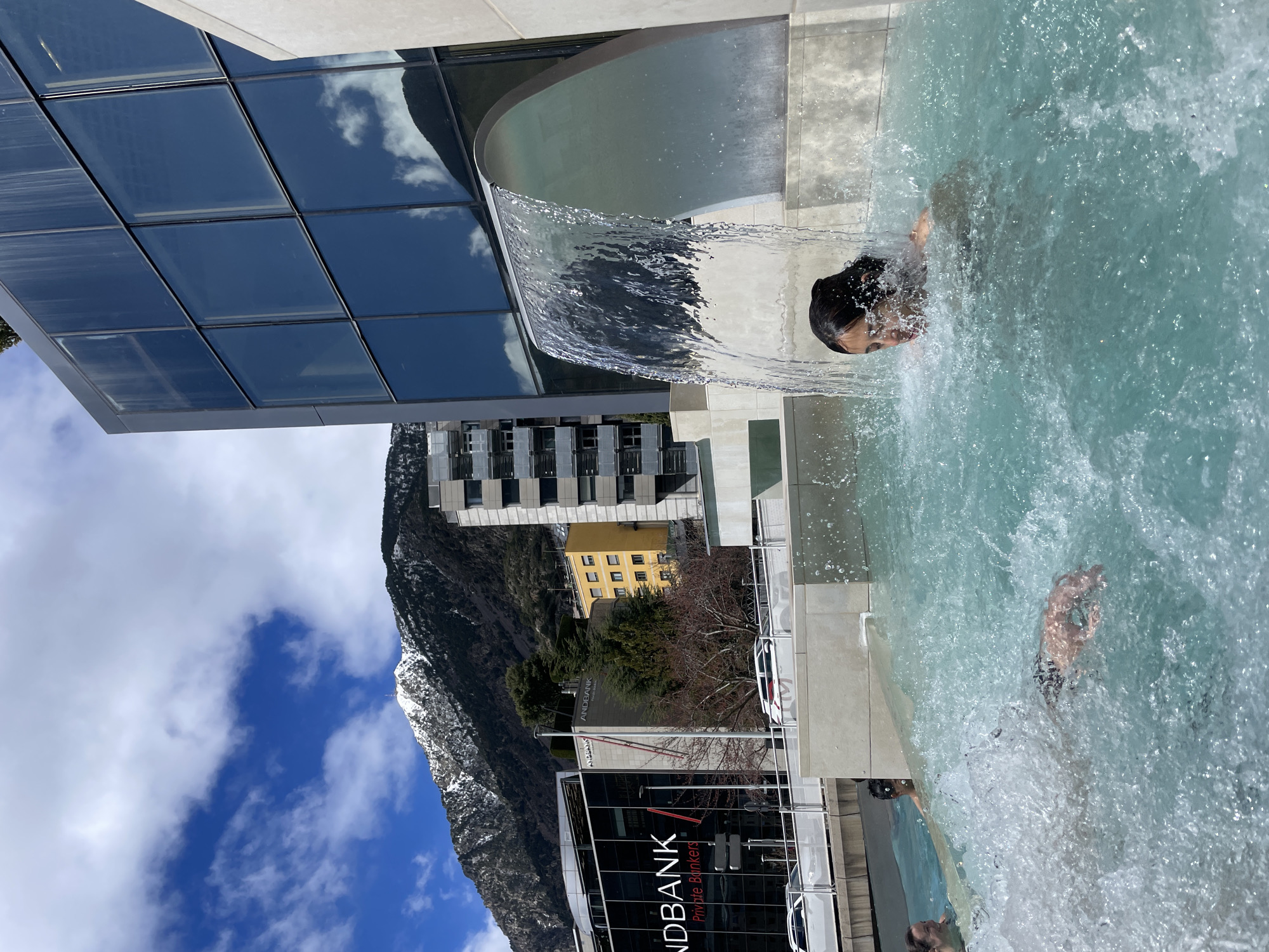 spa setting in Les Escaldes, Andorra. A person is submerged in a pool of water beneath a water feature that pours water in a sheet-like manner. The pool's edge is constructed of light-colored stone or concrete. Behind the pool area is a modern building with dark glass windows, reflecting the sky and clouds. In the background, there's a mountain range with visible snow on the peaks, buildings of various heights and colors, and signs for "Andbank - Private Bankers" are visible. The image is taken at an angle, presenting a unique perspective of the scene.