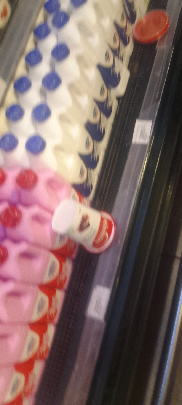 The image displays a refrigerated display case inside a retail establishment located in Viwandani ward, Kenya. The scene is captured from an angled overhead perspective, showing shelves stocked with various packaged goods. The upper shelf contains multiple rows of white plastic bottles, each fitted with a blue cap and bearing a blue label. To the right on this same shelf, a single red, circular object, consistent with a lid, is visible. Below, another shelf holds rows of pink plastic containers, each with a red cap and red label. Among these, one small, individual-serving cup, featuring a white lid and a red base/label, stands upright. The products are arrayed on black, perforated shelving units. Clear plastic price strips are attached to the front edge of the shelves, on which small white price tags are displayed. One visible price tag clearly reads "20.0". No individuals are present in the frame.