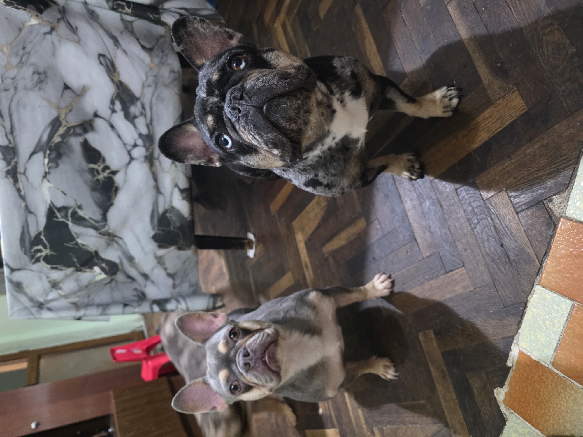 Within an interior space in Dupnitsa, Bulgaria, two French Bulldogs are positioned on a dark wooden parquet floor laid in a herringbone pattern. A segment of orange and light green/yellow tiled flooring is visible in the bottom left. The dog on the left is a lilac/blue fawn French Bulldog with white chest markings and tan points, standing and facing directly towards the observer. The dog on the right, positioned slightly closer to the foreground, is a merle French Bulldog with a black, tan, and grey coat pattern, a prominent white chest blaze, and heterochromatic eyes (one blue, one brown/hazel). This dog is also standing and facing directly towards the observer. In the background, a table covered by a black and white marble-patterned tablecloth featuring gold vein accents is visible to the right. To the left, a dark wooden cabinet and a partially visible red plastic stool are present. The area is illuminated by ambient light, casting shadows of the dogs on the wooden floor.