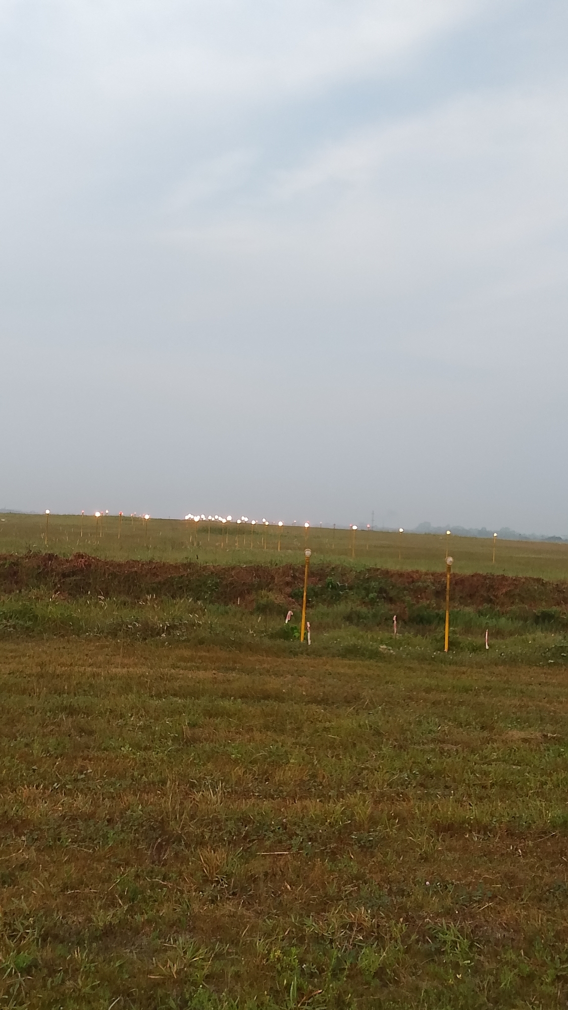 The scene depicts an open field, likely an airfield, in the city of Asubi, Nigeria, under a uniform, light grey overcast sky. The foreground and midground consist of a vast expanse of mixed green and brown grass, interspersed with visible patches of reddish-brown soil and denser vegetation. Several yellow poles, each topped with a small, light-colored spherical object, are sparsely distributed across the midground. In the background, a distinct, horizontal line of numerous illuminated lights extends across the entire width of the frame, receding into the distance. These lights, mounted on individual poles, display colors ranging from white/yellow to orange/red. The distant horizon is obscured by atmospheric haze, blending into the sky. No individuals or specific actions are visible within the frame.