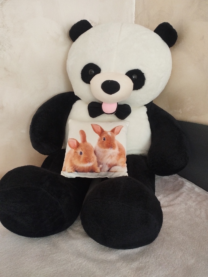 A large plush panda bear is seated upright, facing forward, in an indoor setting in Sveti Vlas, Bulgaria. The bear is predominantly white with black ears, eye patches, snout, arms, and legs. It features black button eyes, a black nose, a light pink tongue-like protrusion, and a small black bow tie affixed below its chin. Against the panda's chest, it holds a small rectangular decorative pillow. The pillow displays a printed image of two light brown rabbits; the rabbit on the left is positioned slightly in front of and to the left of the rabbit on the right, with both facing slightly right. The panda rests against a light-colored, textured surface, possibly a wall or upholstered furniture, and sits on a light gray, textured fabric surface, likely a blanket or cushion.