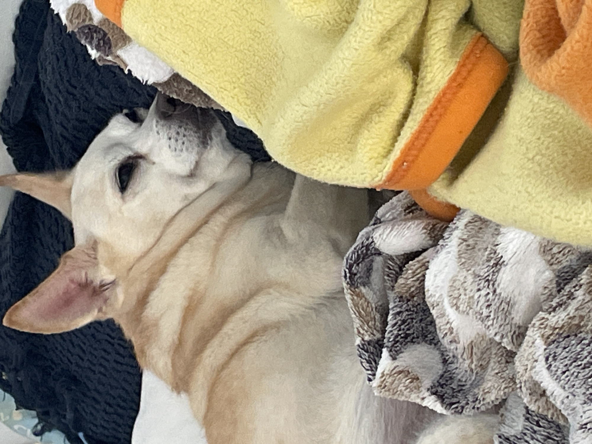 A light-colored dog with short fur is lying down, seemingly resting or sleeping, partially covered by folded towels and blankets