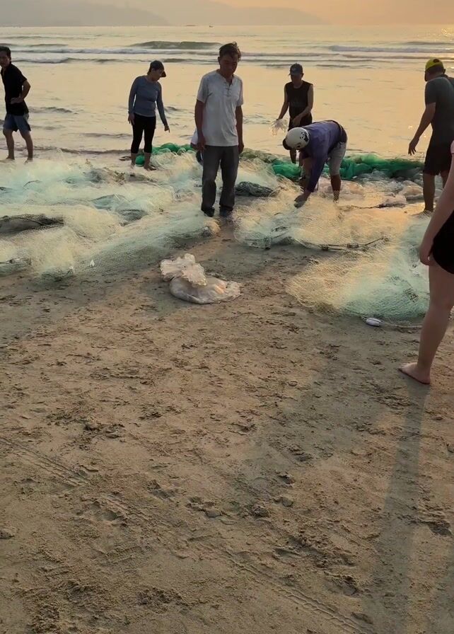 The scene captures a group of people engaged in activities on a sandy beach during a golden hour setting. The sun reflects brilliantly off the water in the background. In the foreground, there is a large fishing net spread out on the sand, around which people are gathered. Some are standing around the net, while others are bending over, appearing to examine or work on it. In the lower right of the frame, a woman wearing a pink t-shirt and black shorts is seen walking barefoot across the sand. The general impression is one of work or activity related to fishing at the beach during sunset.
