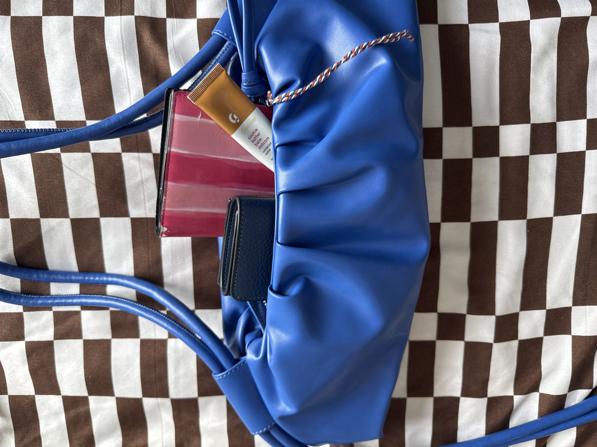 A still life image displays a cobalt blue, gathered-style pouch or small bag containing several personal items, positioned on a brown and white checkered fabric background