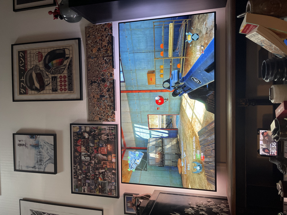 The image displays a television screen showcasing a first-person shooter video game, with a blue futuristic weapon in the foreground. Game elements include a minimap, score indicators, and a health bar. The scene appears to be set in an industrial or warehouse-like environment. The wall surrounding the TV is adorned with framed artwork and prints, including a poster featuring Daft Punk helmets and other framed pictures, which appear to be black-and-white. The time on a nearby device reads 16:36.