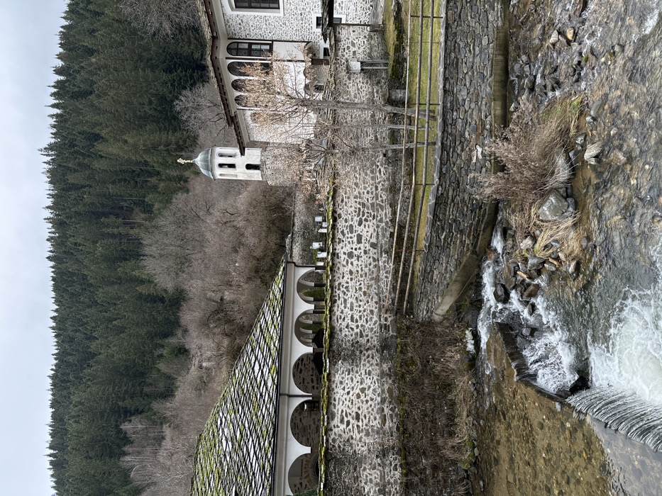 The image displays a detailed view of a river and architectural structures within Shiroka Laka, Bulgaria, under an overcast sky. In the foreground, a clear river flows from left to right, featuring a man-made weir creating a small waterfall and rapids. The riverbed is stony, with an accumulation of dry, reedy vegetation on the right bank. Above the river, a sturdy stone retaining wall, constructed from irregular grey and brown stones, spans horizontally across the mid-ground. A short, two-rail wooden fence borders the top of this wall, enclosing a small patch of green grass. A small concrete channel empties into the river from beneath the wall on the right side. Several slender, bare deciduous trees are visible in this area. In the background, on the left, stands a large traditional building with white arched openings forming a ground-floor portico. Its roof is covered with grey tiles heavily encrusted with green moss. To the right of the image center, a prominent white bell tower with a domed top and a golden cross is visible, indicating an Orthodox church or monastery. Adjacent to the bell tower, another multi-story stone building features arched windows on its upper floor. The far background is dominated by steep hillsides densely covered with dark green coniferous forest, extending to the horizon under the uniform grey sky. No individuals or active human interactions are depicted within the scene.