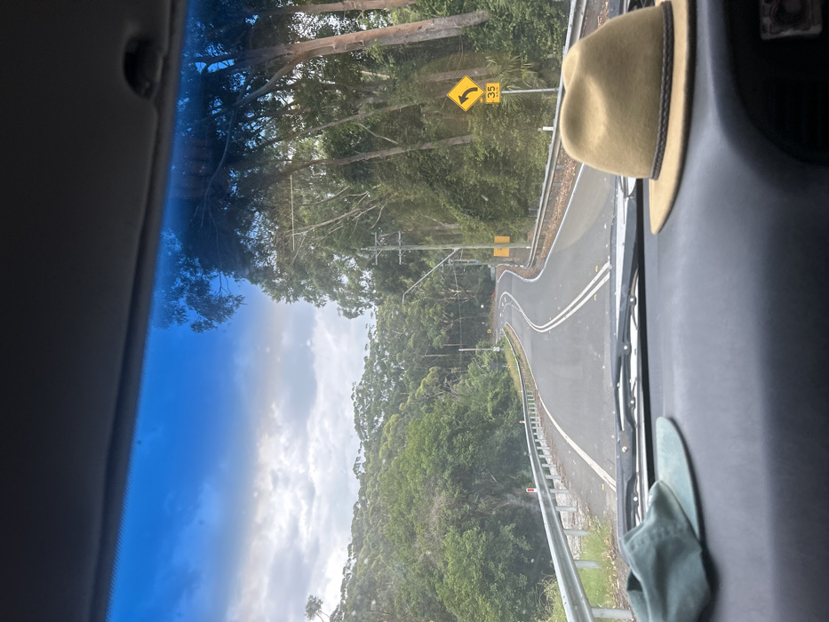 A view from inside a vehicle shows a winding road ahead, passing through a dense forest. A yellow and black sign warns of a sharp left turn with a speed limit of 35. The road is asphalt with double white lines marking the center. A beige hat is perched on the dashboard. The sky is visible through the trees, with a mix of blue and clouds. A metal guardrail runs along the side of the road.