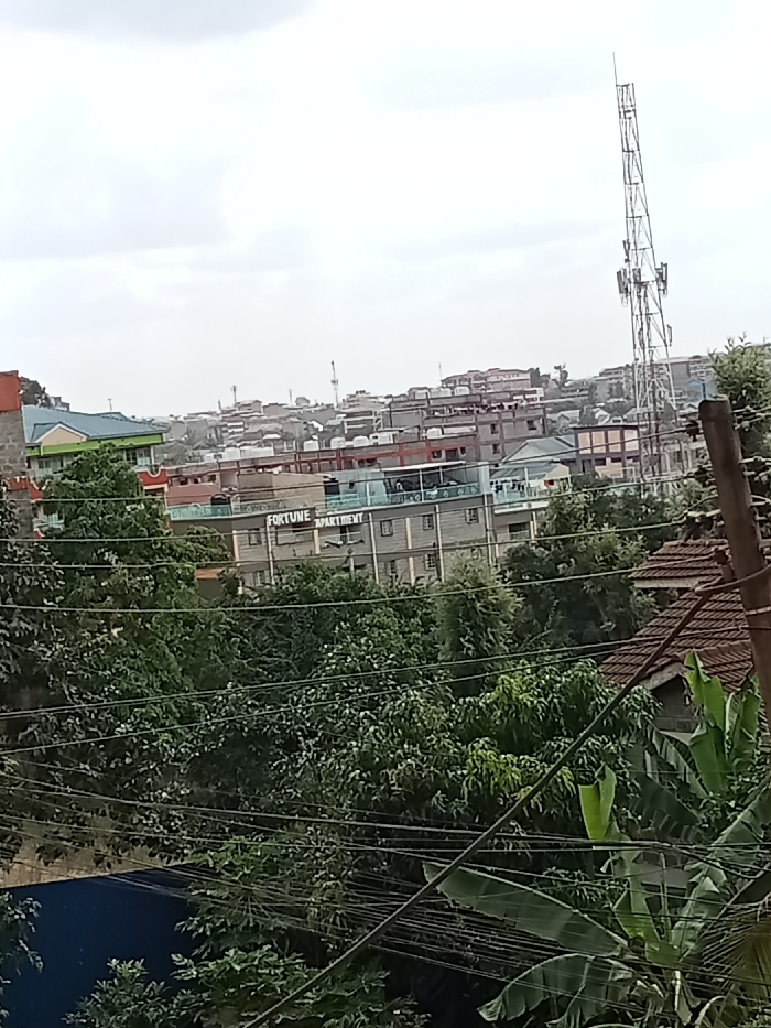 The image depicts an elevated, oblique view of a dense urban landscape in Unknown, Unknown, under an overcast sky. The foreground is dominated by a dense canopy of various green trees and multiple intersecting black utility lines stretching horizontally across the frame. On the far right, a dark brown utility pole with attached wires is partially visible, alongside a section of a red-tiled roof and large green leaves, possibly from banana plants. A dark blue tarp or roof structure is partially visible on the lower left. In the midground, beyond the tree line, multiple multi-story buildings are visible. A prominent light grey building centrally positioned features "FORTUNE APARTMENT" written in white capital letters across its upper facade. To its left, another building displays a distinctive light green roof. Several buildings in the midground and background are equipped with water tanks on their rooftops. The background reveals a sprawling urban area characterized by numerous densely packed residential and commercial structures extending to the hazy horizon. A tall, lattice-structured telecommunication tower, fitted with multiple antennae, stands conspicuously on the right side of the background, rising above the city skyline. The sky is uniformly overcast and grey. No individuals or specific activities are discernible within the scene.